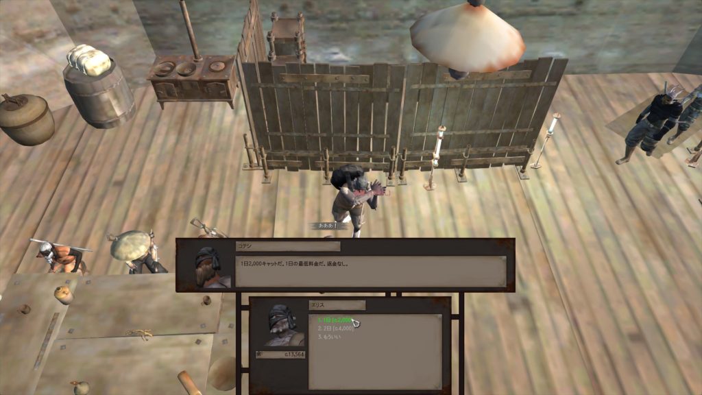 ボーのステータスが正常になっているのを確認したら、店主(奴隷商人のボス)を右クリック長押し > 「話をする」からボーを購入すると、ボーがプレイヤーの仲間になります。